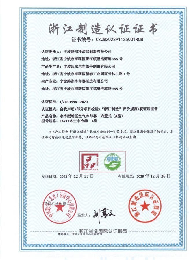 寧波路潤冷卻器制造有限公司自主創(chuàng)新研發(fā)的水冷型增壓空氣冷卻器一內置式(A型),以品質優(yōu)、技術新和過硬的產品質量,并按照浙江制造的“國內一流,國際先進”的定位,經過“基本要求、技術要求、試驗方法、檢驗規(guī)則和質量與服務承諾等方面的審定,獲得“品字標浙江制造”認證。